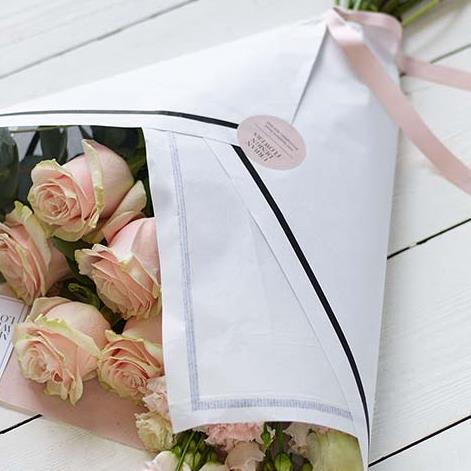 A collection of stunning pink flowers in a sleek white gift wrap. A marvel of minimalism, all ready for arranging so they suit a space perfectly.