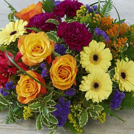 A vibrant posy featuring germini, roses, carnations and alstroemeria in rich shades.