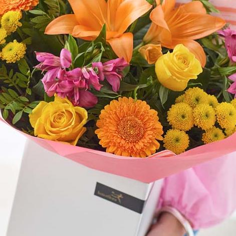 A vibrant bouquet of gorgeous fresh and bright flowers, expertly arranged by a skilled local florist. It could feature hot pink flowers, or blooms in shades of fiery orange or rich yellow. It all depends on what’s fresh and the occasion – every bouquet is beautifully unique.
