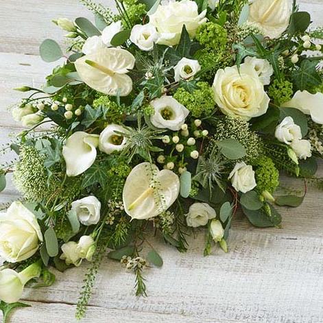 A lush blend of white and green featuring calla lilies, anthurim, and virburnum opulus. Ivy weaves elegantly through the teardrop shape.