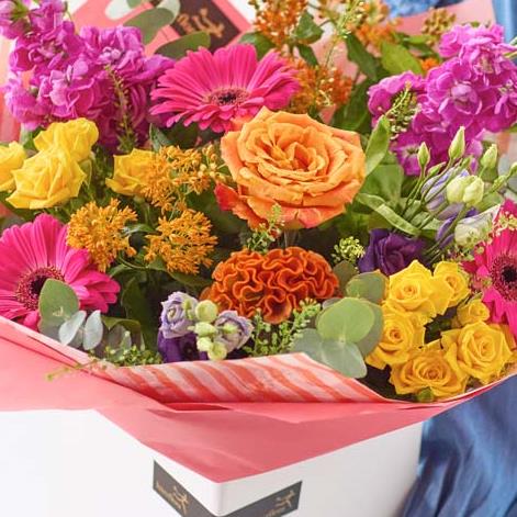 A vibrant bouquet of gorgeous fresh and bright flowers, expertly arranged by a skilled local florist. It could feature hot pink flowers, or blooms in shades of fiery orange or rich yellow. It all depends on what’s fresh and the occasion – every bouquet is beautifully unique.