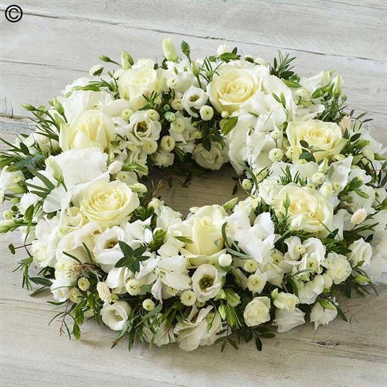 A profusion of white blooms, this elegant wreath features the finest hydrangeas, fragrant rosemary and dried lagarus 'bunny tails'.